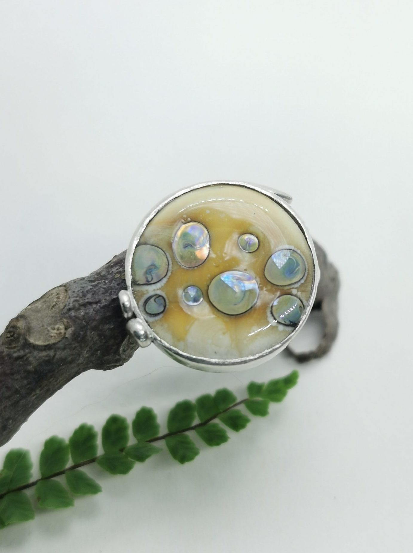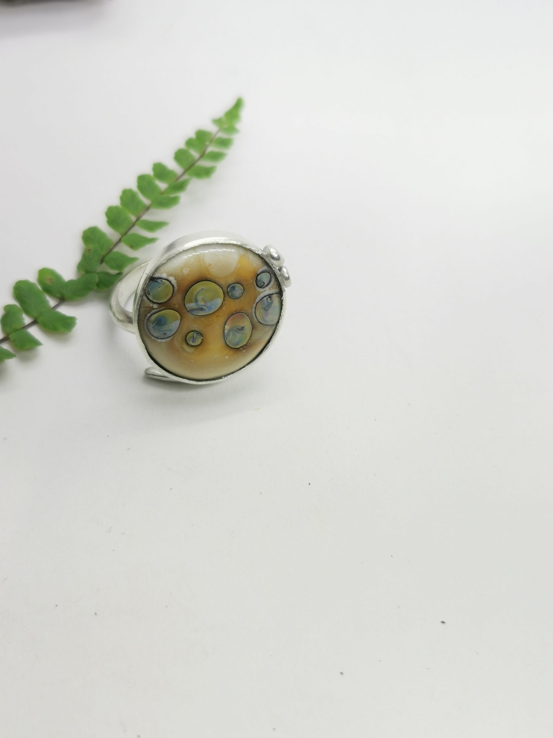 Bague cabochon en verre fabriqué au chalumeau. Diamètre environ 20 mm.