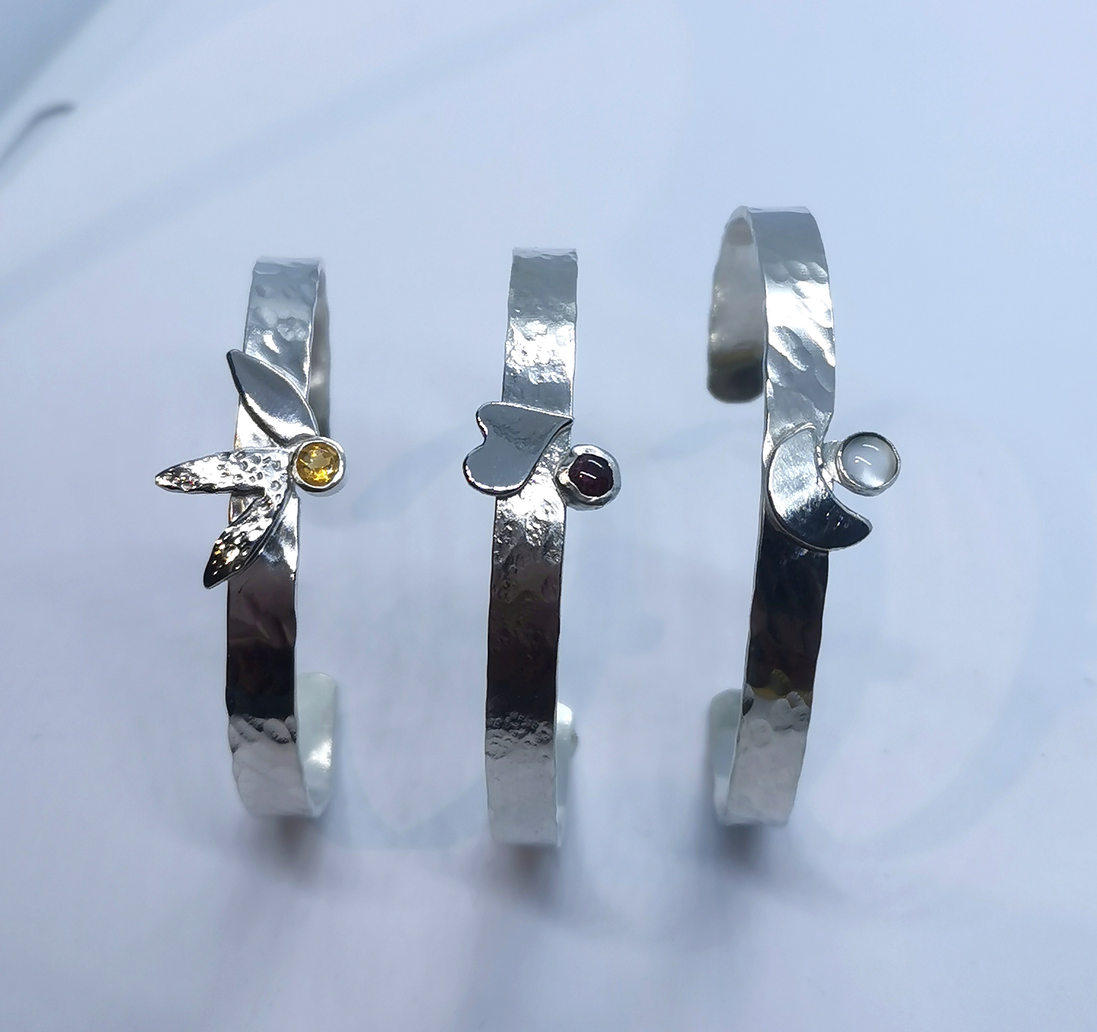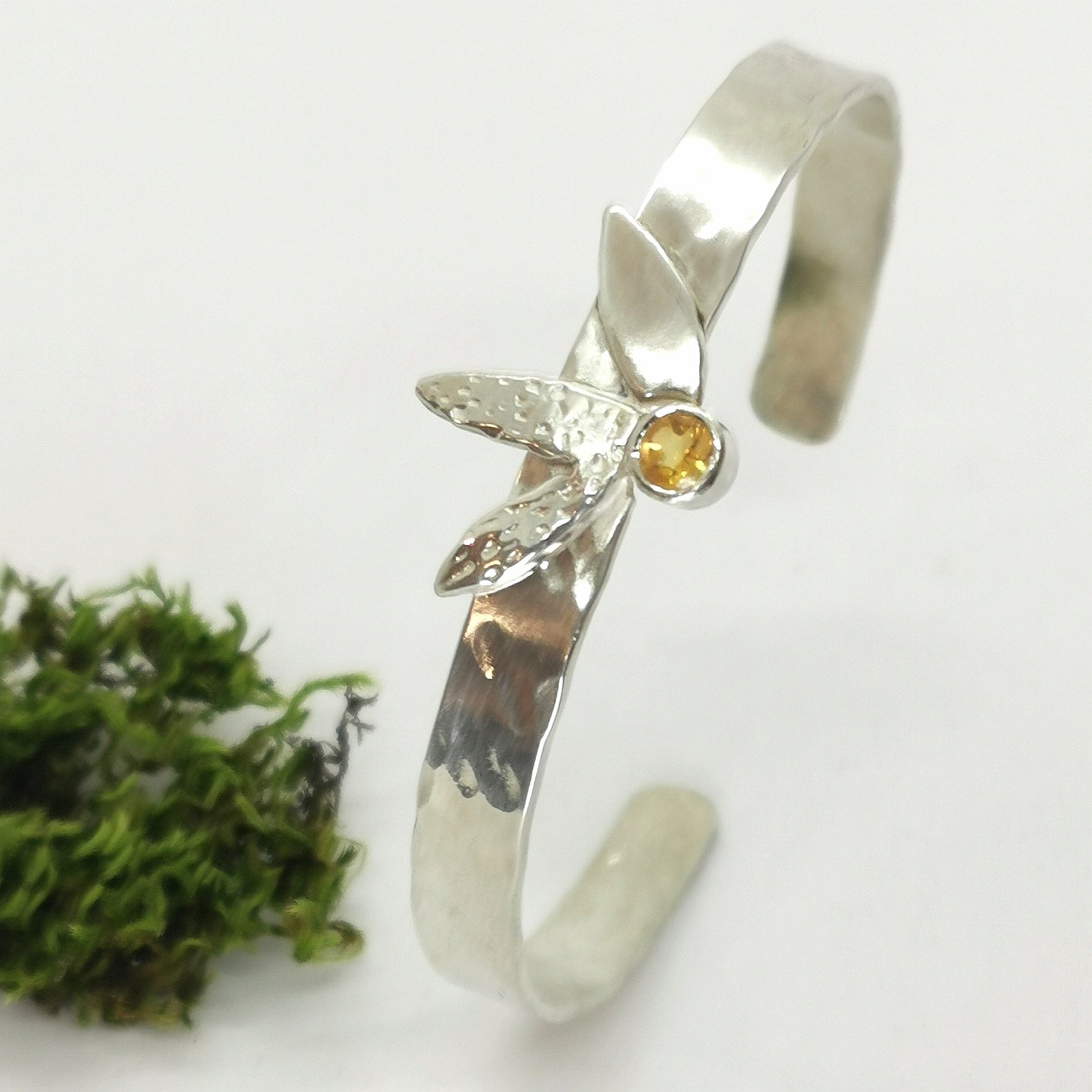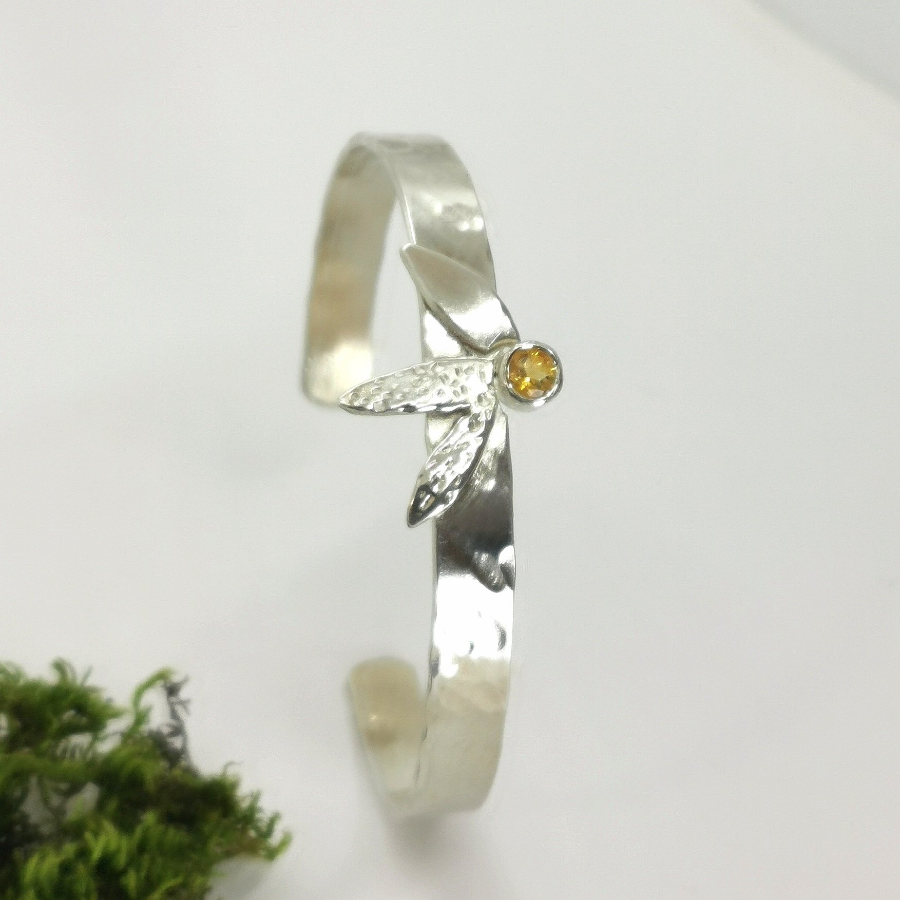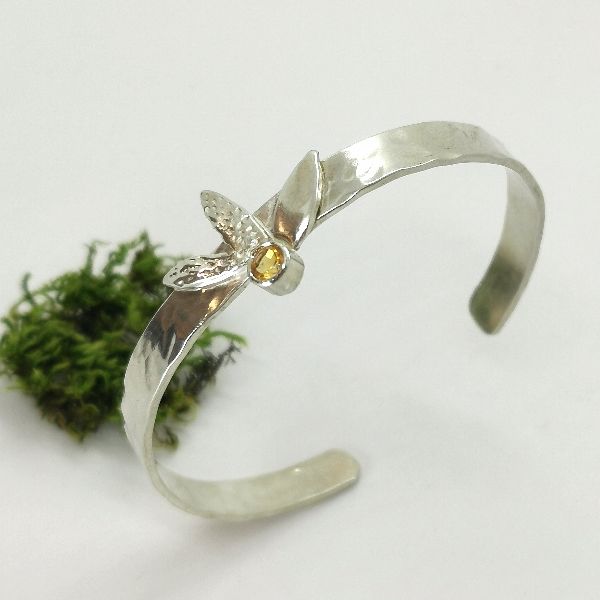 Très beau bracelet en argent massif 925 martelé avec une « marguerite » éfeuillée dans l’esprit « je t’aime, un peu, beaucoup… » avec une magnifique citrine pour le coeur de la fleur.